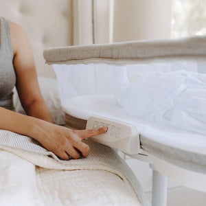 The Luxe Series model has a soothing center with an amber nightlight, amber floor light, two levels of vibration, soothing sounds with volume control and an auto shutoff. Two storage pockets keep necessities close at hand. Plus, it converts from bassinest to portable nest with the push of a button. It’s also designed with premium furniture-grade finishes and a machine washable luxe fabric that zips off for easy cleaning.