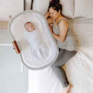 With the HALO BassiNest, baby can be near you at night, but secure in their own defined space—it’s perfect for parents who want closeness but don’t feel comfortable co-sleeping. Use the 360 degree swivel to move the bassinet in next to you when you’re sleeping, then swivel it away so you can get out of bed more easily in the morning. The retractable, locking side wall lowers to make it convenient to tend to baby from bed (especially helpful for nighttime nursing or moms recovering from C-sections).