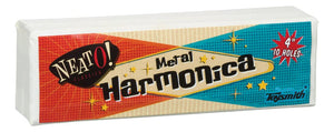 At only 4 inches long, this easy-to-hold metal harmonica from Neato! features a 10-hole design for easy musical fun. Fits easily into small hands and helps cultivate a sense of sound, musical scale, and play. Comes in an assortment of beautiful colors with metal luster inside a 4.25 x 1-inch portable hinged case.