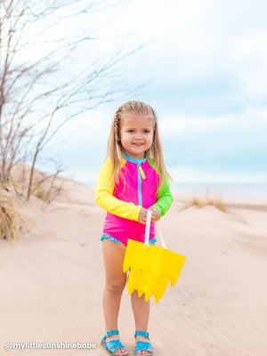 Ruffle Butts Neon Color Block Long Sleeve One Piece Rash Guard Swimsuit