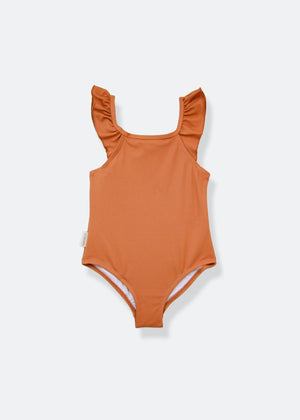 This adorable swimsuit boasts a playful ruffle design around the shoulders, making it perfect for a day of fun in the sun. * Sustainable Recycled Nylon * Jersey Lining * Ruffle Shoulder Strap * 4-Way Stretch for comfortable fit * Non-Toxic * UPF 50+ * Quick Dry * Chlorine Resistant * Sustainable * OEKO-TEX Class I certified