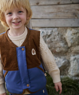 When the cooler days call for adventure, our Down Vest steps up to the challenge. Made from planet-friendly materials, it brings cozy warmth, colour-block fun, and a whimsical motif that adds playfulness to every outing.