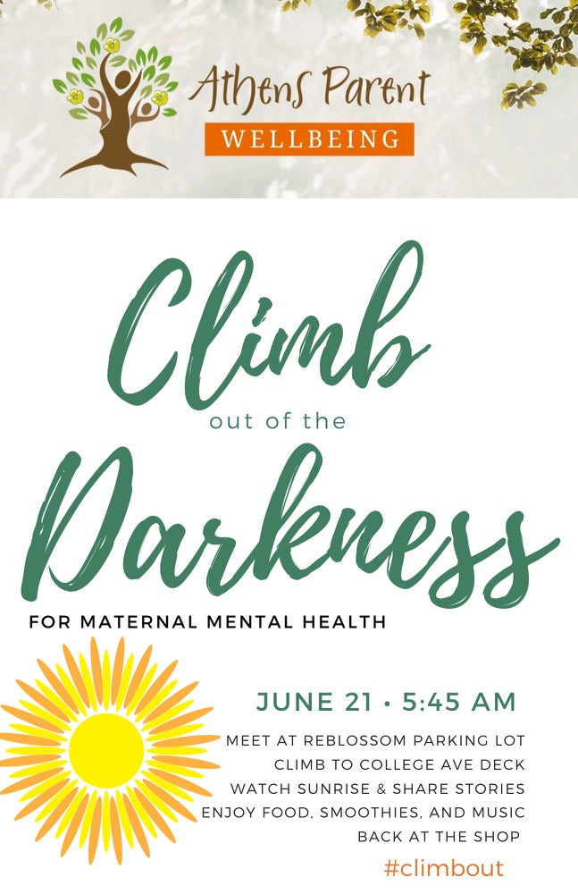 Walk from reBlossom Mama & Baby Shop down Hancock/Reese to Clayton/Washington to the College Avenue Parking deck (1 mile), up the stairs (elevator available for anyone who'd prefer), to the roof to watch the sunrise and literally Climb out of the Darkness of perinatal mental health disorders including postpartum anxiety, depression, OCD, PTSD & psychosis. Share stories of recovery and hear what has helped mamas climb out of the darkness.